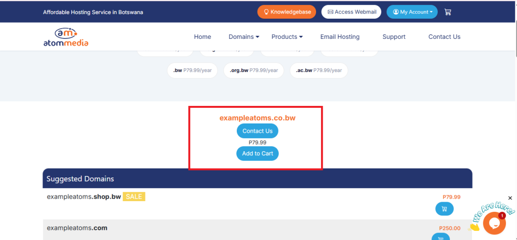 Registering a domain name with Atom Media  is an easy process; Firstly visit http://shop.atommedia.co.bw/ and in the click on domains or click here to navigate directly to domain registration page.
